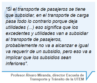 Frente a ello, el profesor anticipa que, “si el transporte de pasajeros se tiene que subsidiar, en el transporte de carga pasa todo lo contrario porque deja utilidades (…) eso significa que los excedentes y utilidades van a subsidiar al transporte de pasajeros, probablemente no va a alcanzar e igual va requerir de un subsidio, pero eso va a implicar que los subsidios que habla Errázuriz sean inferiores”.