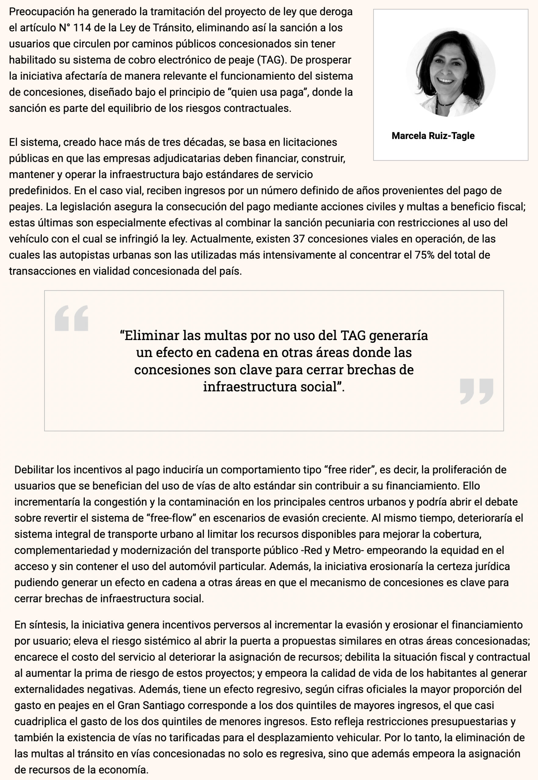 DIARIO FINANCIERO – “Eliminar las multas por no uso del TAG generaría un efecto en cadena en otras áreas donde las concesiones son clave para cerrar brechas de infraestructura social”.