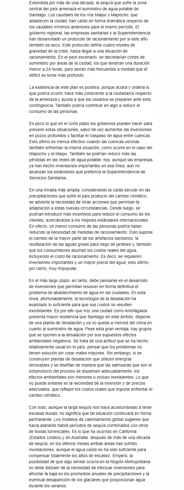 EL MERCURIO – La existencia de este plan es positiva, porque aclara y ordena lo que podría ocurrir, hace más consciente de la amenaza a la ciudadanía y podría contribuir a reducir el consumo.
