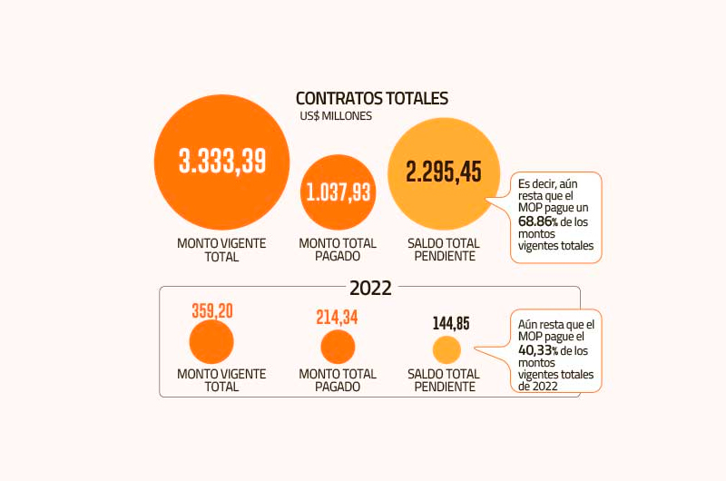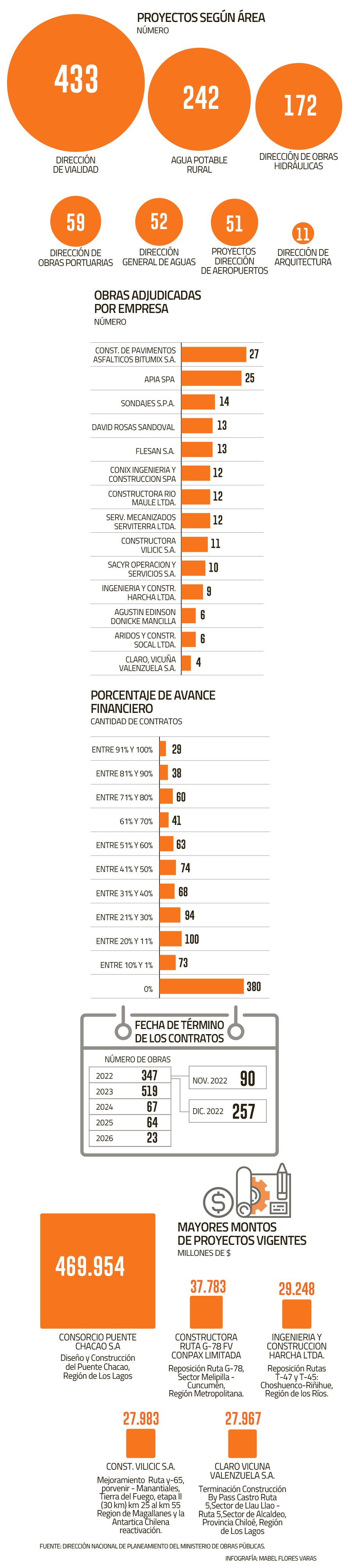 Según información pedida por transparencia a la Dirección de Planificación del MOP, al cierre de octubre de este año esa cartera contaba con 1.020 contratos correspondientes a obras hidráulicas, portuarias y de vialidad, entre otras, que contemplan una inversión total de más de US$ 3.300 millones y cuyo plazo de ejecución máximo abarca desde el 2022 hasta 2026.
