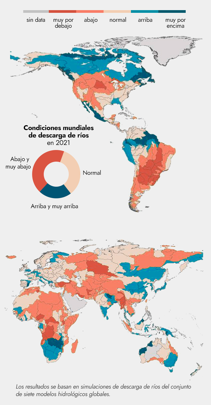 - En cambio, “se observaron caudales fluviales mayores de lo normal en algunas cuencas de América del Norte, el norte de la Amazonía y África meridional (Zambezi y Orange), así como en China (la cuenca del río Amur) y el norte de la India”.