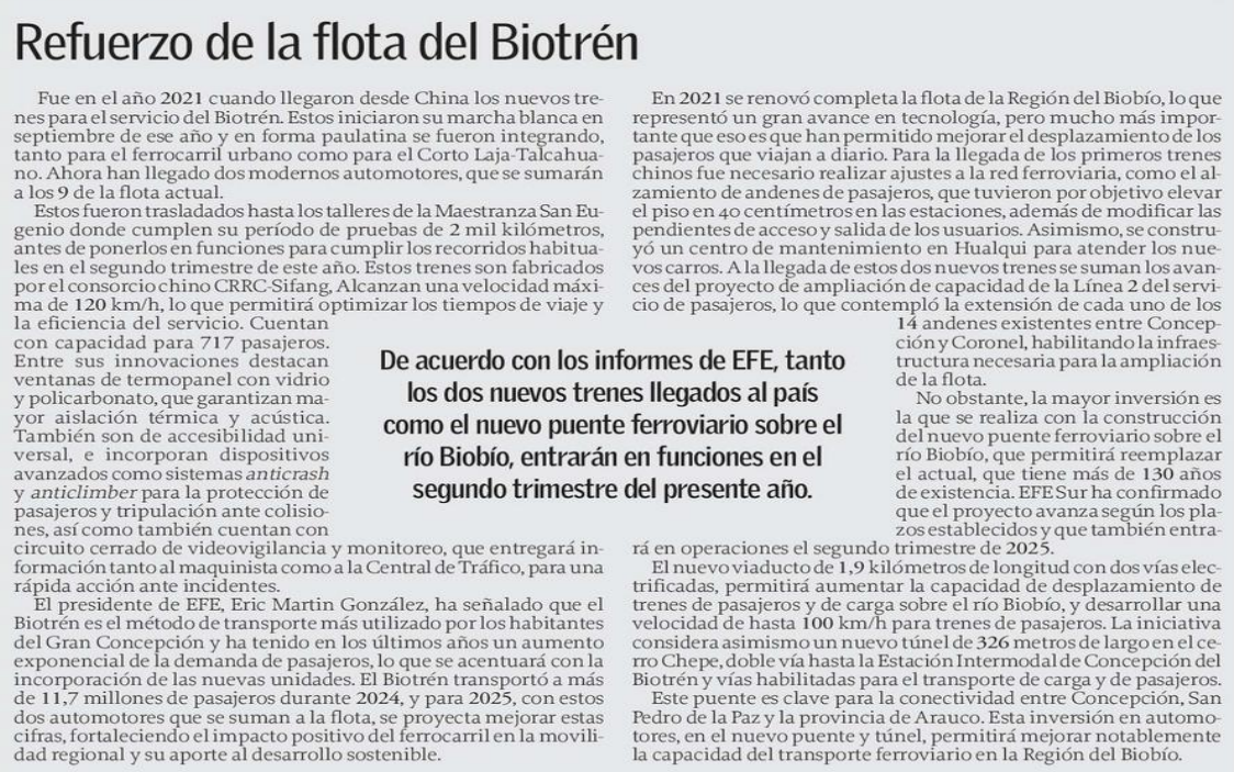 EL SUR – De acuerdo con los informes de EFE, tanto los dos nuevos trenes llegados al país como el nuevo puente ferroviario sobre el río Biobío, entrarán en funciones en el segundo trimestre del presente año.