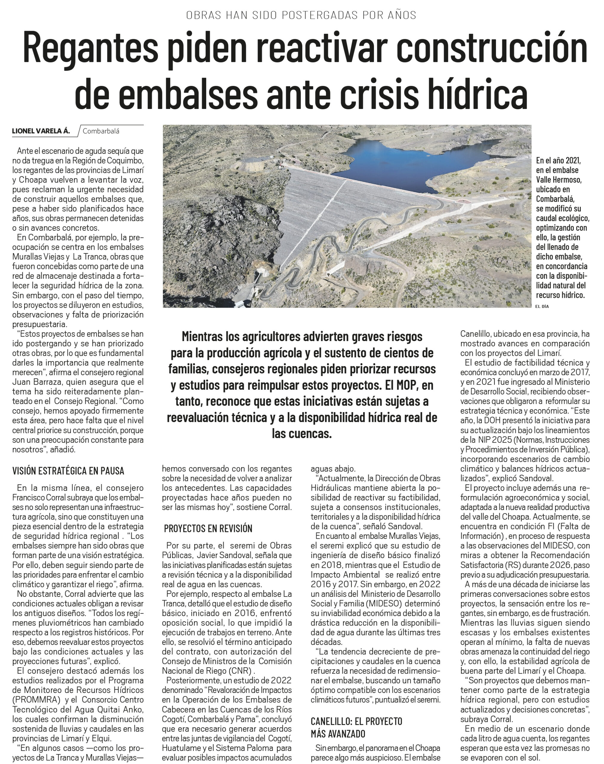 EL DÍA – Mientras los agricultores advierten graves riesgos para la producción agrícola y el sustento de cientos de familias, consejeros regionales piden priorizar recursos y estudios para reimpulsar estos proyectos