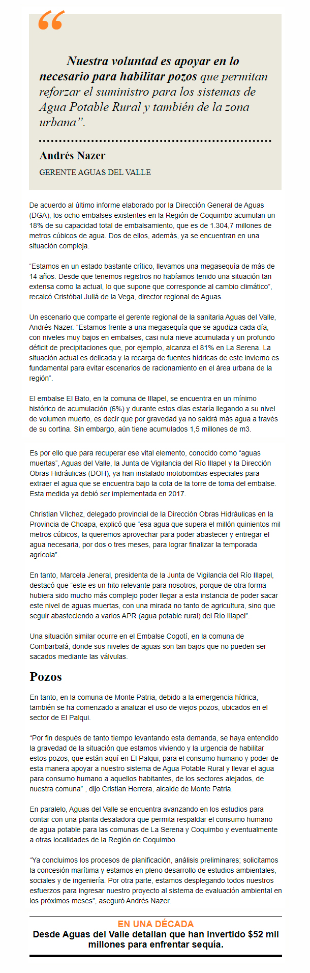 EL MERCURIO – El recurso que no puede ser evacuado por gravedad desde las represas debe ser sacado mediante motobombas espaciales. Los municipios también están trabajando en recuperar viejo pozos en sectores rurales.