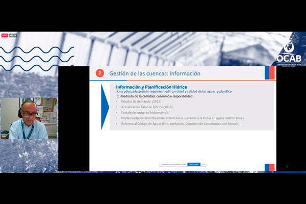 Respecto al monitoreo de la cantidad de agua, especificó que se deben verificar el consumo y la disponibilidad y que se han concretado acciones como el Estudio de demanda (2015), la Actualización balance hídrico (2019), el fortalecimiento red hidrométrica, la Implementación monitoreo de extracciones y la Reforma al Código de Aguas, que actualmente se tramita en la Comisión de Constitución del Senado.