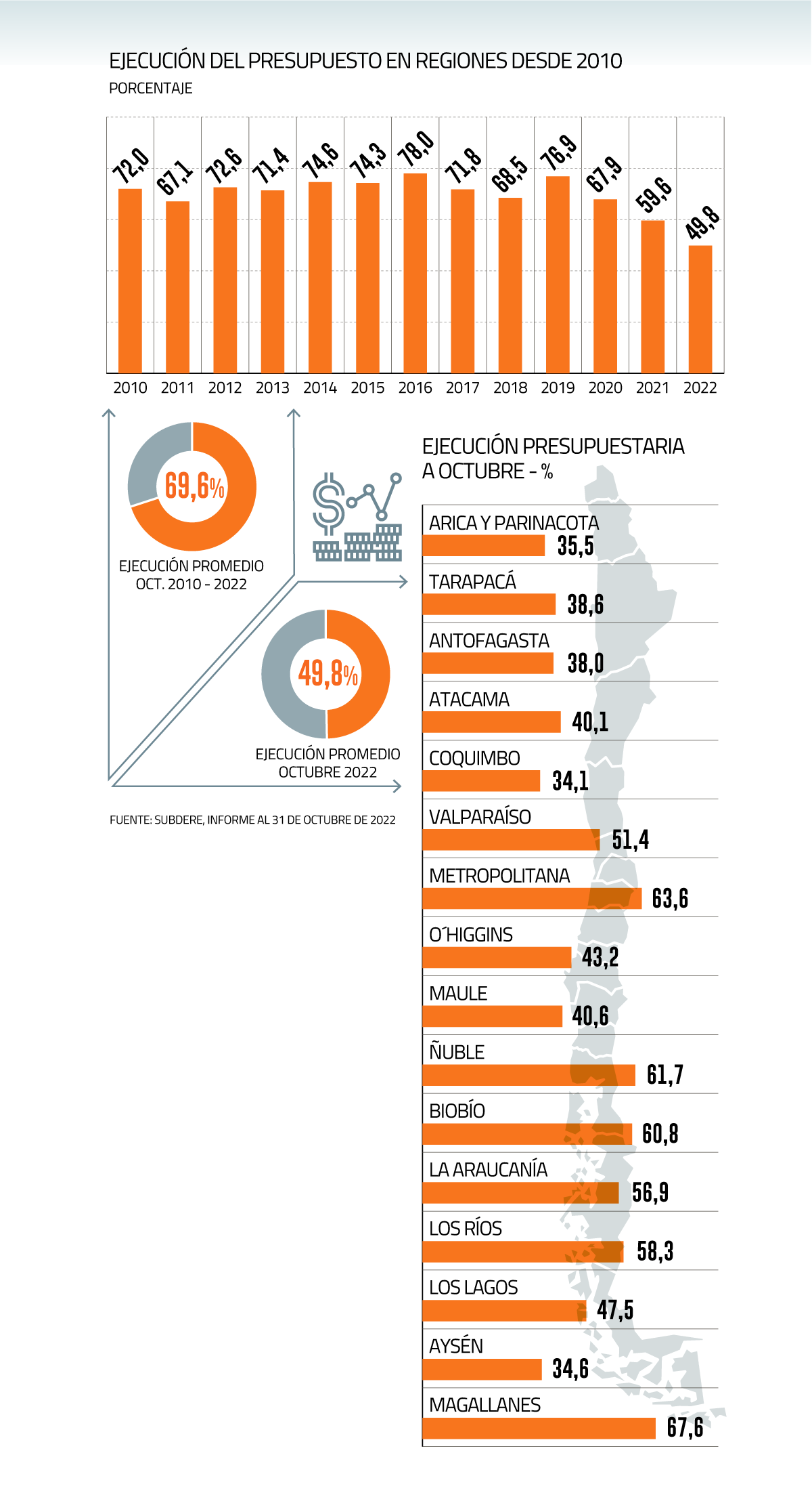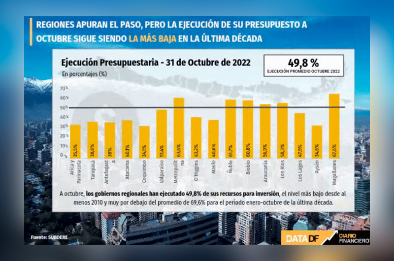 Así lo muestran los datos publicados por la Subsecretaría de Desarrollo Regional y Administrativo (Subdere). A octubre, los gobiernos regionales han ejecutado 49,8% de sus recursos para inversión, el nivel más bajo desde al menos 2010 y muy por debajo del promedio de 69,6% para el período enero-octubre de la última década.