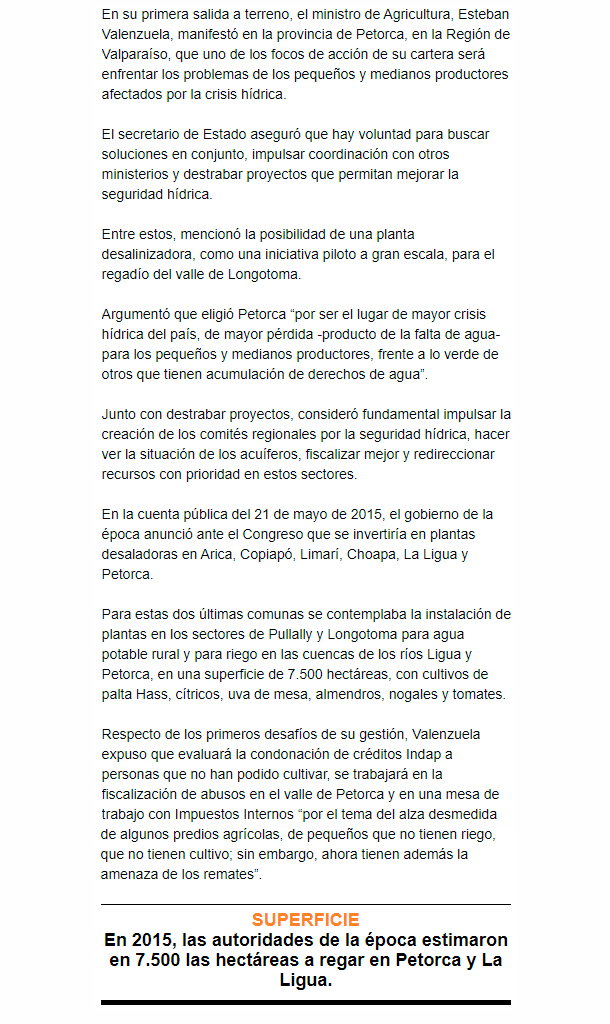 EL MERCURIO – El ministro Valenzuela eligió Petroca para su primera actividad en terreno “por ser el lugar de mayor crisis hídrica del país y el de mayor pérdida para los productores”.