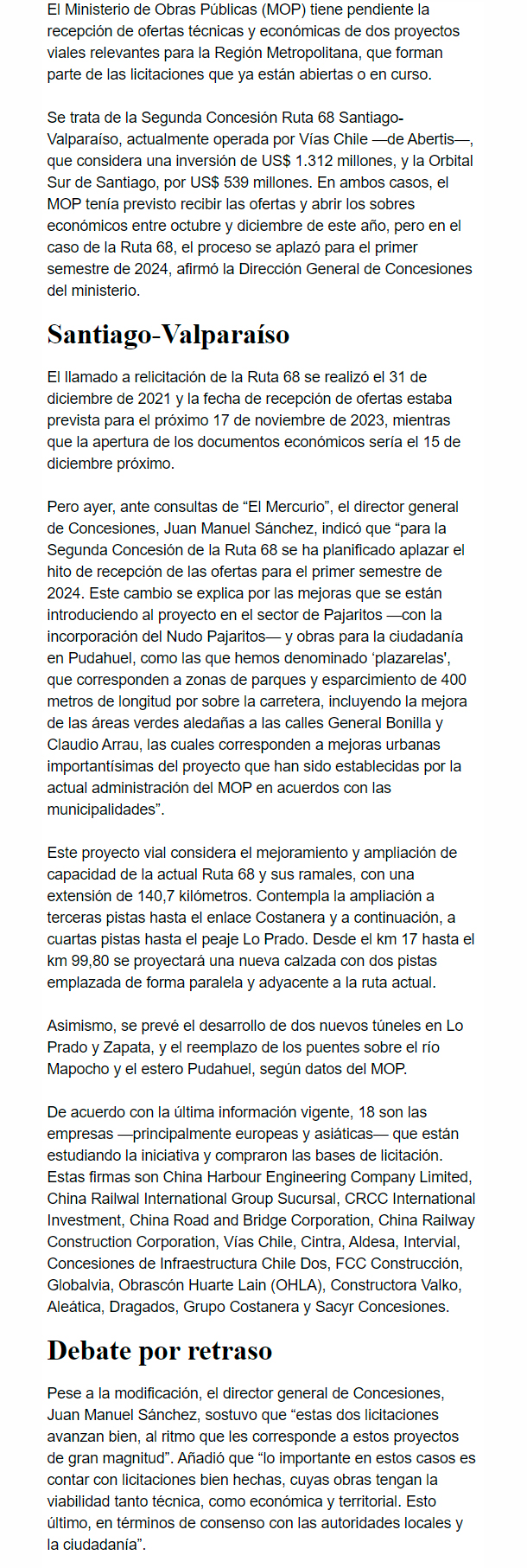 EL MERCURIO – La admisión de propuestas estaba prevista para noviembre. En el caso de la Orbital Sur de Santiago, se mantienen las fechas.