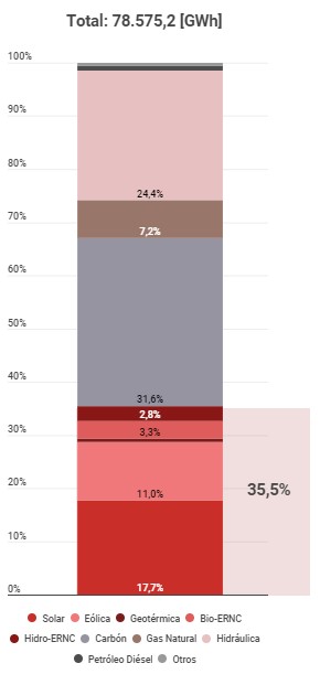 Tanto así que a partir de este año se espera que el aporte de las fuentes renovables no convencionales -es decir, eólica, solar, geotermia, hidro ERNC y bio ERNC- supere al del carbón, que a pesar del retiro de varias unidades debido al plan de descarbonización, mantiene un aporte superior al 30% de la matriz.