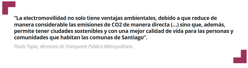“La electromovilidad no solo tiene ventajas ambientales, debido a que reduce de manera considerable las emisiones de CO2 de manera directa, una de las principales causales del calentamiento global; sino que, además permite tener ciudades sostenibles y con una mejor calidad de vida para las personas y comunidades que habitan las comunas de Santiago”, resalta Paola Tapia, ex ministra de TRansporte y Telecomunicaciones y actual Directora de Transporte Público Metropolitano (DTPM).