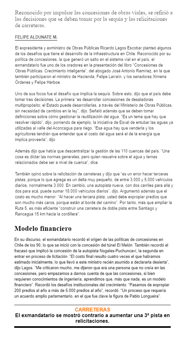 Ricardo Lagos E. plantea desafíos en materia de infraestructura