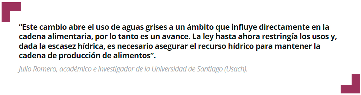 En la misma línea, Julio Romero Figueroa, académico e investigador de la Universidad de Santiago (Usach) considera que esta modificación es “importantísima”. “Si bien ya se había avanzado con la Ley 21.075, este cambio abre el uso de aguas grises a un ámbito que influye directamente en la cadena alimentaria, por lo tanto es un avance. La ley hasta ahora restringía los usos y, dada la escasez hídrica, es necesario asegurar el recurso hídrico para mantener la cadena de producción de alimentos”, sostiene el investigador especialista es tratamiento de aguas grises.