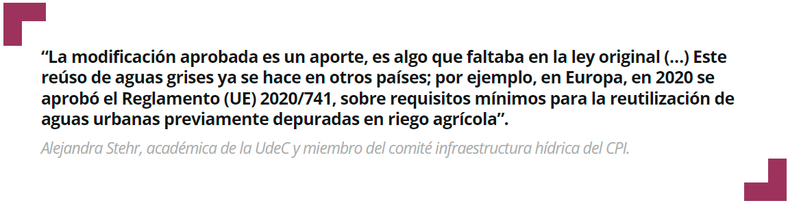 Alejandra Stehr Gesche, académica de la Facultad de Ingeniería de la Universidad de Concepción (UdeC), señala, en tanto, que la modificación aprobada “es un aporte. Es algo que faltaba en la ley original”. “Todo suma, sobre todo en zonas que están muy afectadas por la sequía. Este reúso de aguas grises ya se hace en otros países; por ejemplo, en Europa, en 2020 se aprobó el Reglamento (UE) 2020/741, sobre requisitos mínimos para la reutilización de aguas urbanas previamente depuradas en riego agrícola. Ahí se establecen una serie de detalles, criterios y normas que se deben cumplir, entre ellos las diferentes calidades de agua (4), dependiendo si es para regar hortalizas, frutales, tubérculos, etc.”