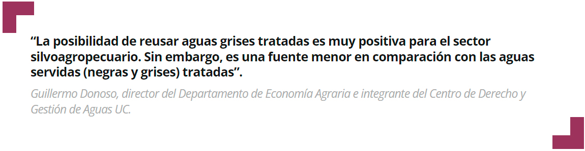 EL profesor Guillermo Donoso, en tanto, cree que actualmente existe un problema importante para implementar la reciente modificación a la Ley 21.075 y: “No hay una infraestructura que recoja las aguas grises, a diferencia de las aguas servidas, ya que tenemos alcantarillados que se destinan a la planta de tratamiento y hay una infraestructura que permite recolectarlas y tratarlas. Hoy día si en una vivienda se hace la inversión de separar aguas grises de negras, puedo poner una planta de tratamiento muy simple, muy pequeña, y usar esas aguas en el riego de los jardines. Para poder usarlas en el sector silvoagropecuario necesitamos generar un volumen considerable, y para eso necesito recolectar aguas grises de múltiples fuentes, acopiarlas, tratarlas y luego poder usarlas. Entonces falta toda esa infraestructura”.