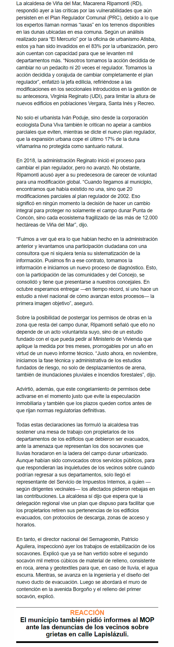 EL MERCURIO – El municipio también pidió informes al MOP ante las denuncias de los vecinos sobre grietas en calles aledañas.