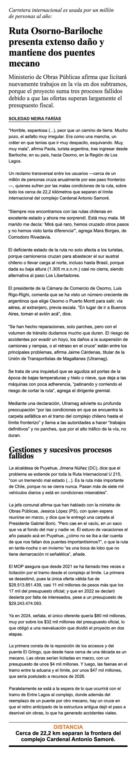 EL MERCURIO – MOP afirma que licitará nuevamente trabajos en la vía en dos subtramos, porque el proyecto suma tres procesos fallidos debido a que las ofertas superan largamente el presupuesto fiscal.