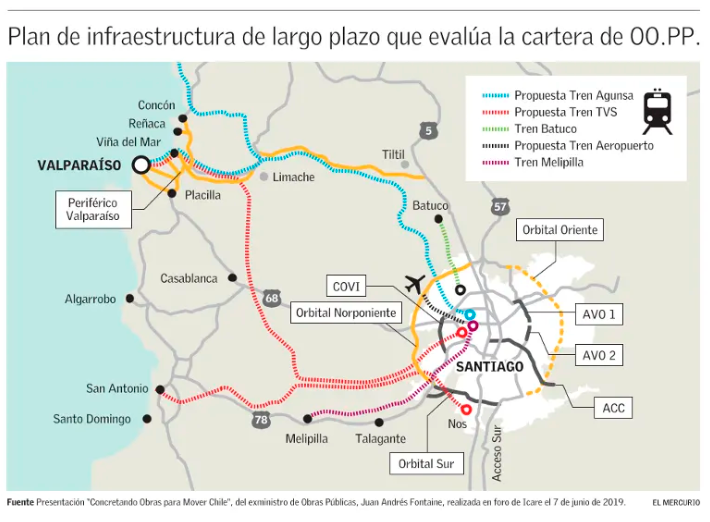 EL MERCURIO – Nuevas rutas orbitales en las regiones Metropolitana, de Valparaíso y del Biobío; otra carretera a la costa, en particular alternativa a la Ruta 68 por el Camino La Dormida; una opción a la Ruta 5 por la Cuesta Chada, un aeropuerto adicional en la zona central y trenes de cercanía.