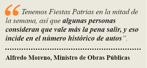 A juicio de Alfredo Moreno, ministro de Obras Públicas, constituye “un desafío histórico” la coordinación y la logística para los próximos días. Esto, porque el panorama, que supera las cifras del año pasado —cerca de 590 mil vehículos—, es producto “de cómo se dieron los días. Tenemos Fiestas Patrias en la mitad de la semana, así que algunas personas consideran que vale más la pena salir y eso incide en el número histórico de autos”.