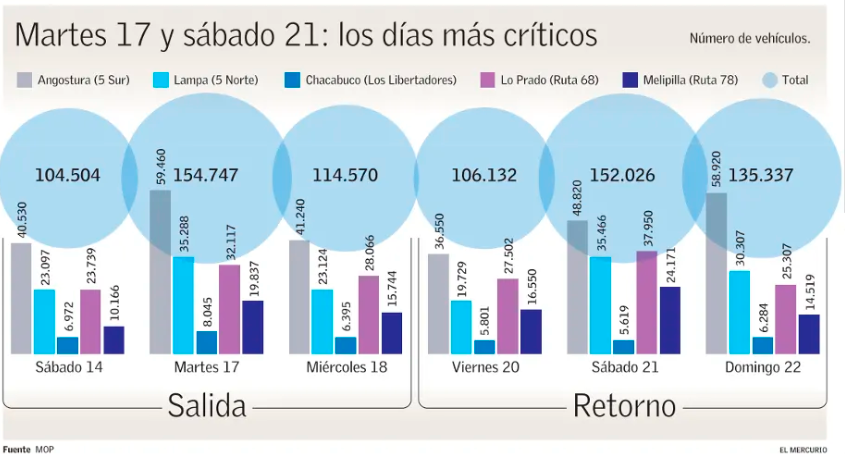 De acuerdo con las proyecciones del Ministerio de Obras Públicas (MOP), el éxodo masivo comenzará este viernes, con 99 mil vehículos, principalmente durante la noche. Pero el martes 17 se prevé como la jornada más crítica: se esperan 154 mil autos que, en el caso de la Ruta 5 Sur, en Angostura, superarán los 4.500 por hora entre las 17:00 y 19:00 horas.