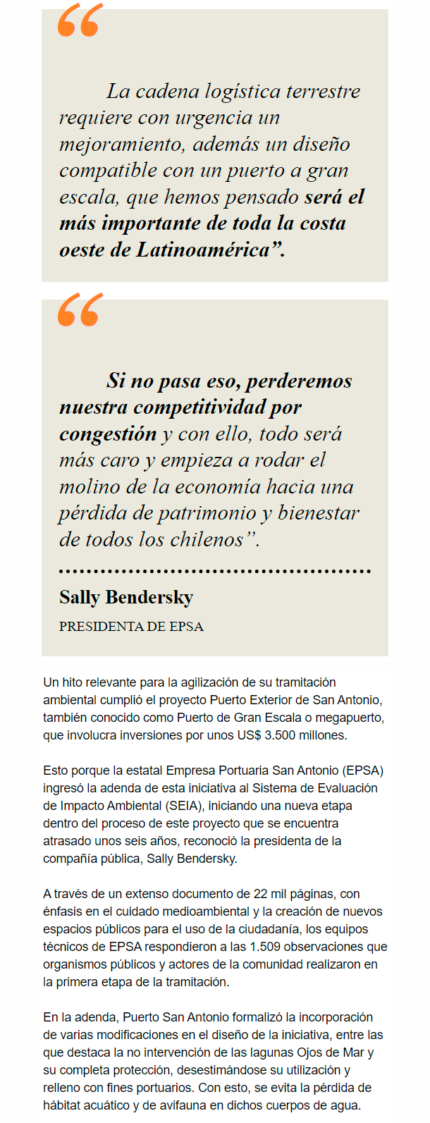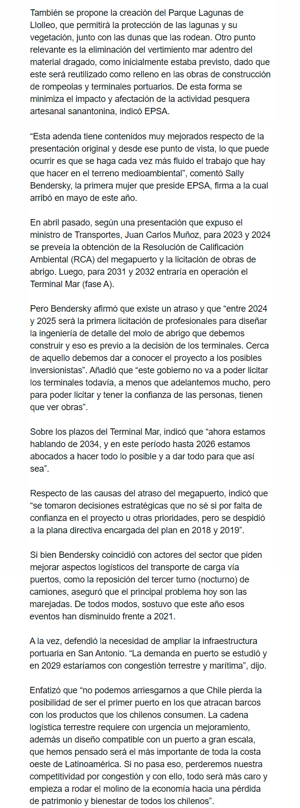 EL MERCURIO – La presidenta de EPSA admitió que existe un retraso en la iniciativa y el primer terminal concesionado estaría entrando en operaciones recién en 2034 y no en 2031.