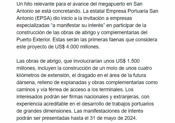 Noticias San Antonio Megapuerto: Parte invitación a primeras obras By Estefania Rodriguez Abril 2, 2024 0 805 Compartir WhatsAppLinkedinEmail EL MERCURIO – Incluyen un molo de cuatro km Fuente: El Mercurio, Martes 02 de Abril de 2024 EL MERCURIO – Incluyen un molo de cuatro km Fuente: El Mercurio, Martes 02 de Abril de 2024 Compartir WhatsAppLinkedinEmail Artículo anteriorObras de Puente Chacao llegan al 50% y en Chiloé esperan que esté listo en 2026Artículo siguienteImacec de 4,5% de febrero mejora el ánimo del mercado y las expectativas de crecimiento del PIB 2024 suben a rango entre 2% y 3% TITULARES Martín Arrau y pagos del TAG: “Está sobre la mesa revisar la política tarifaria nacional” Titulares Diciembre 12, 2025 Expertos analizan impactos y proyecciones del Tren Limache-Puerto a 20 años de su puesta en marcha Titulares Diciembre 12, 2025 Brasil, México, Chile y Colombia lideran infraestructura digital Titulares Diciembre 12, 2025 Nuevo Bypass de Puchuncaví abre este 15 de diciembre: reduce viajes de 15 a 3 minutos y moderniza la Ruta F-20 Titulares Diciembre 12, 2025 Autoridades de Valparaíso llaman a candidatos presidenciales a potenciar la región Titulares Diciembre 12, 2025 Quien usa paga: el principio en juego por Marcela Ruiz-Tagle O. Titulares Diciembre 12, 2025 Ciudades Verdes: Una política que se juega en el diseño urbano por Montserrat del Pino Titulares Diciembre 12, 2025 Avanzan los proyectos de trenes Alameda-Melipilla y Melipilla-Batuco: EFE adjudica obras tecnológicas por $176 mil millones Titulares Diciembre 12, 2025