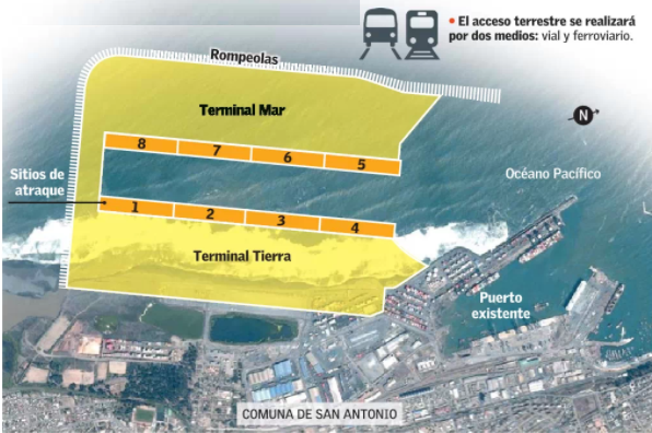 El proyecto, que comenzaría a operar desde 2030 y se hará mediante concesiones a privados, prevé atender a ocho naves portacontenedores de hasta 400 metros de eslora, movilizando cerca de seis millones de teus; es decir, el triple de la capacidad de San Antonio en 2017. La iniciativa considera también obras de conectividad vial y ferroviaria.
