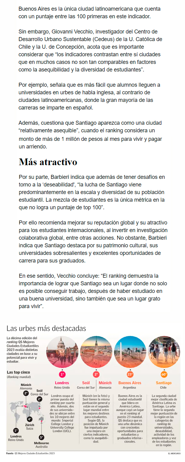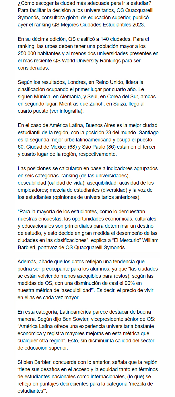 EL MERCURIO – La clasificación usó indicadores que miden factores como la asequibilidad y la puntuación de las universidades.