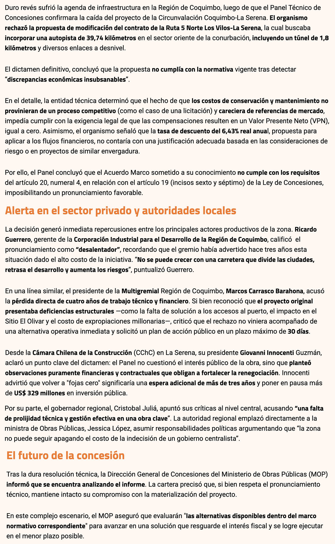 DIARIO FINANCIERO – El Panel Técnico de Concesiones determinó que los costos operacionales de las obras proyectadas no provienen de un proceso competitivo y cuestionó la consistencia de la tasa de descuento utilizada. Gremios locales y autoridades advierten sobre el duro golpe a la inversión y a la conectividad regional tras este revés administrativo.