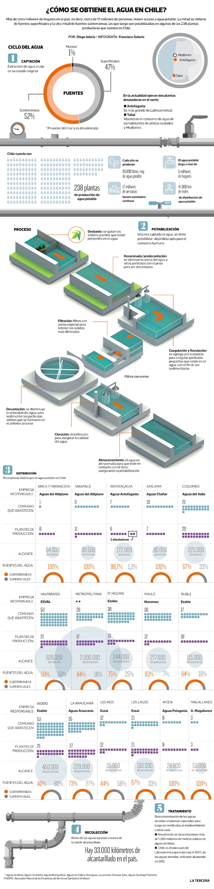LA TERCERA – Más de cinco millones de hogares en el país, tienen accesos a agua potable. La mitad se obtiene de fuentes superficiales y la otra mitad de fuentes subterráneas. También hay 238 plantas productoras de agua.