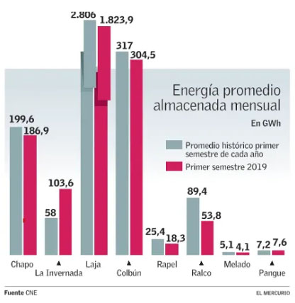 El más representativo del listado es el embalse Laja, el cual cuenta con la mayor capacidad de generación de energía. Al cierre de junio, esta represa acumula un promedio mensual de 1.823 GWh, es decir, un 35% menos que el indicador del primer semestre de los últimos 19 años.