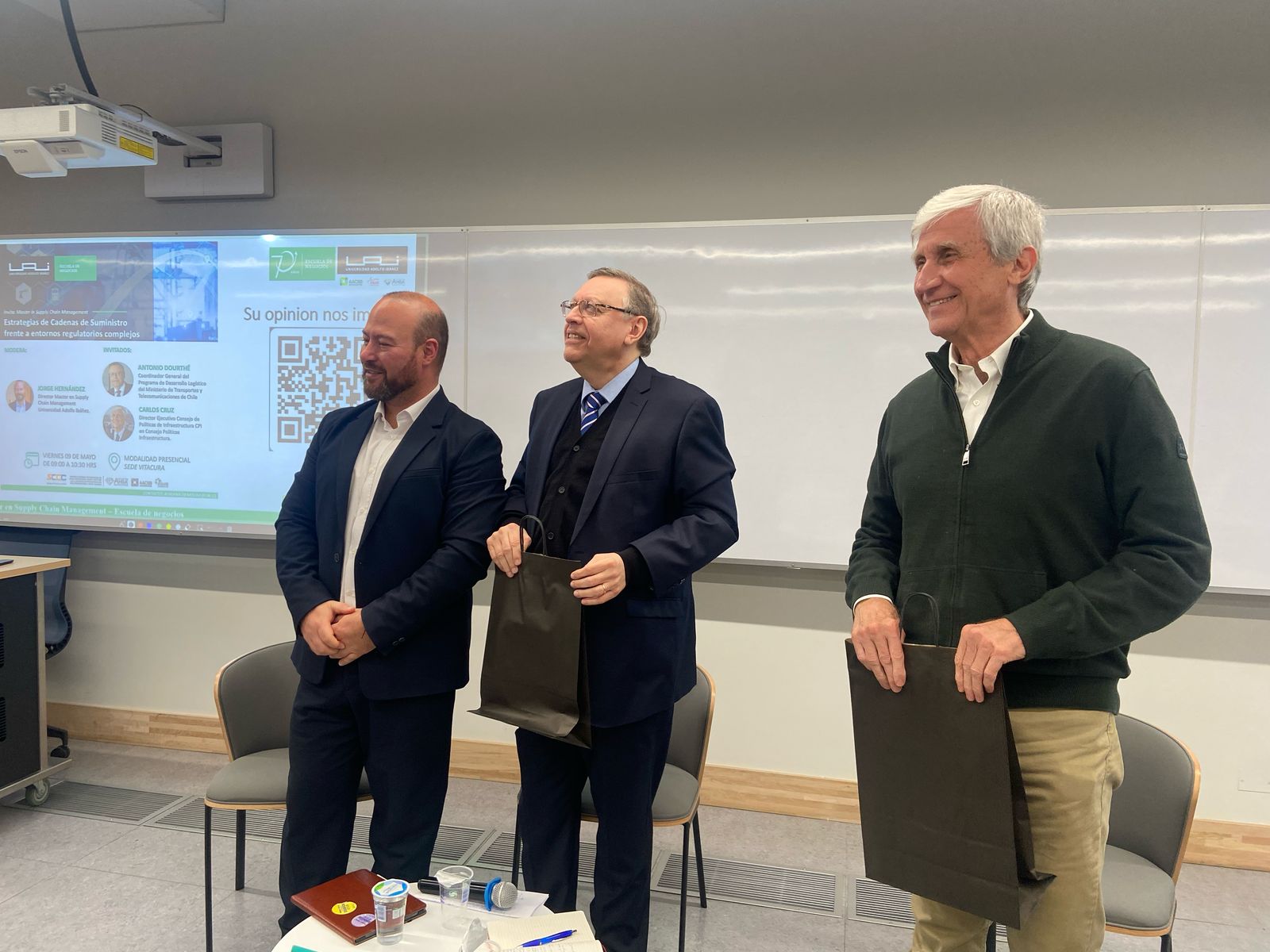 El encuentro, realizado en la sede de Postgrados de la Universidad Adolfo Ibáñez, contó con la participación de Jorge Hernández, director del programa y profesor titular de la Escuela de Negocios, y los panelistas invitados Carlos Cruz, director ejecutivo del Consejo de Políticas de Infraestructura (CPI), y Antonio Dourthé, coordinador general del Programa de Desarrollo Logístico del Ministerio de Transportes y Telecomunicaciones.