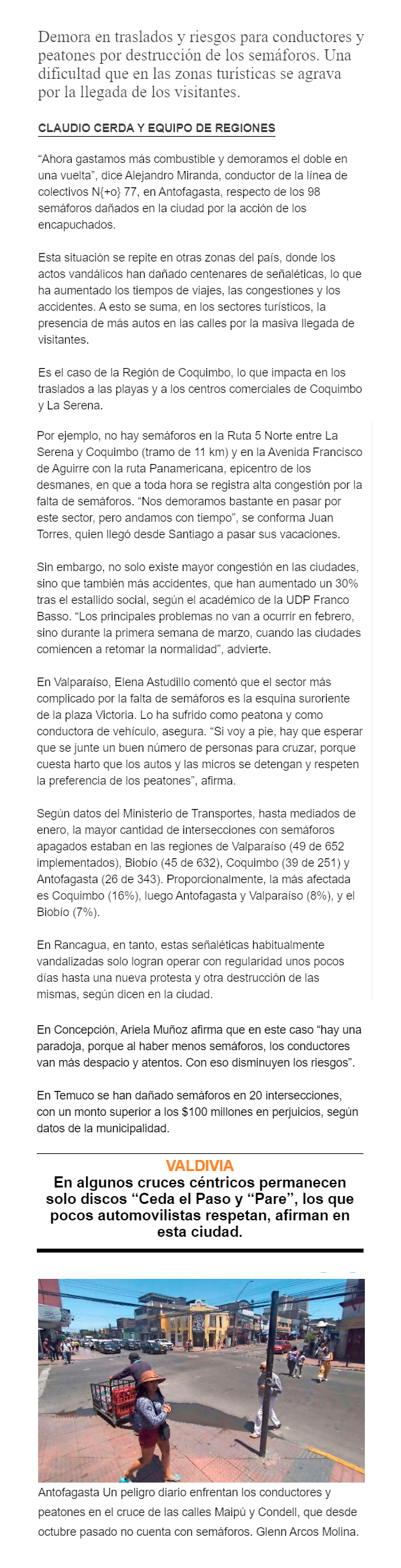 EL MERCURIO – Demora en traslados y riesgos para conductores y peatones por destrucción de los semáforos. Una dificultad que en las zonas turísticas se agrava por la llegada de los visitantes.