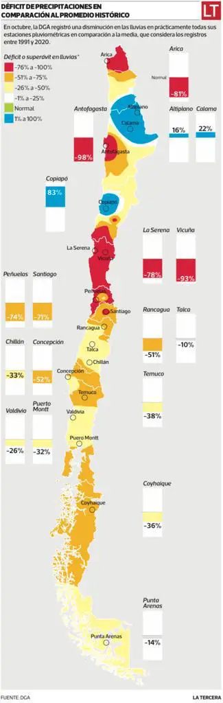 LA TERCERA – Este mes, 184 municipios llegaron a ser declarados con falta extrema de agua, concentrando al 47% de la población. El escenario es desalentador. Según el último Informe Hídrico de la Dirección General de Aguas (DGA), la falta de lluvia en grandes ciudades llega al 98% de déficit en comparación a años normales, mientras pequeños poblados agrícolas se acostumbran a vivir con racionamientos. Si no existe una política global, dicen los expertos, Chile enfrentará graves conflictos los próximos cinco años.
