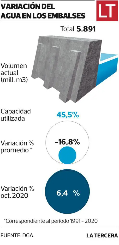 Es por esto que, pese a la falta de lluvias, se registró en octubre un aumento de 48,6% en la cantidad de agua depositada en los embalses del país, en comparación a la misma fecha del año pasado. El deshielo, producido principalmente entre los 3.500 y 5.000 metros sobre el nivel del mar, es el afluente que mantiene con agua al país.