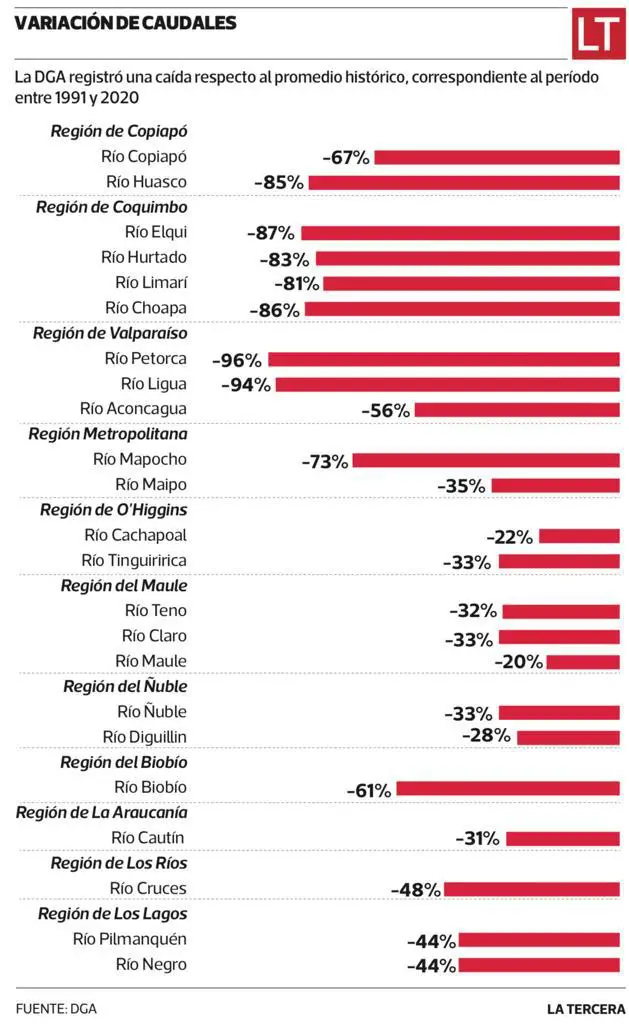 Chile se está secando. Así lo anuncian las principales mediciones hidrográficas, que grafican cómo la privación de agua se extiende por todo el territorio. Actualmente, 184 comunas tienen decretos de escasez hídrica, repartidas desde Atacama a Los Lagos, y 8 millones 250 mil personas viven con racionamiento.