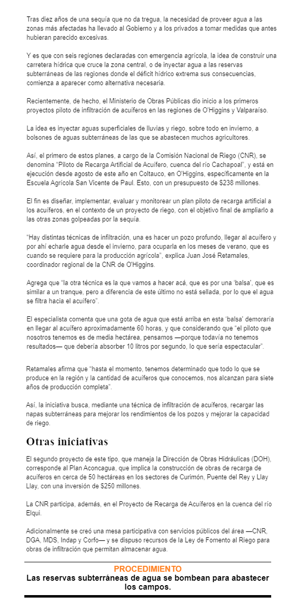 Sequía lleva al MOP a recargar acuíferos en regiones golpeadas por el déficit hídrico