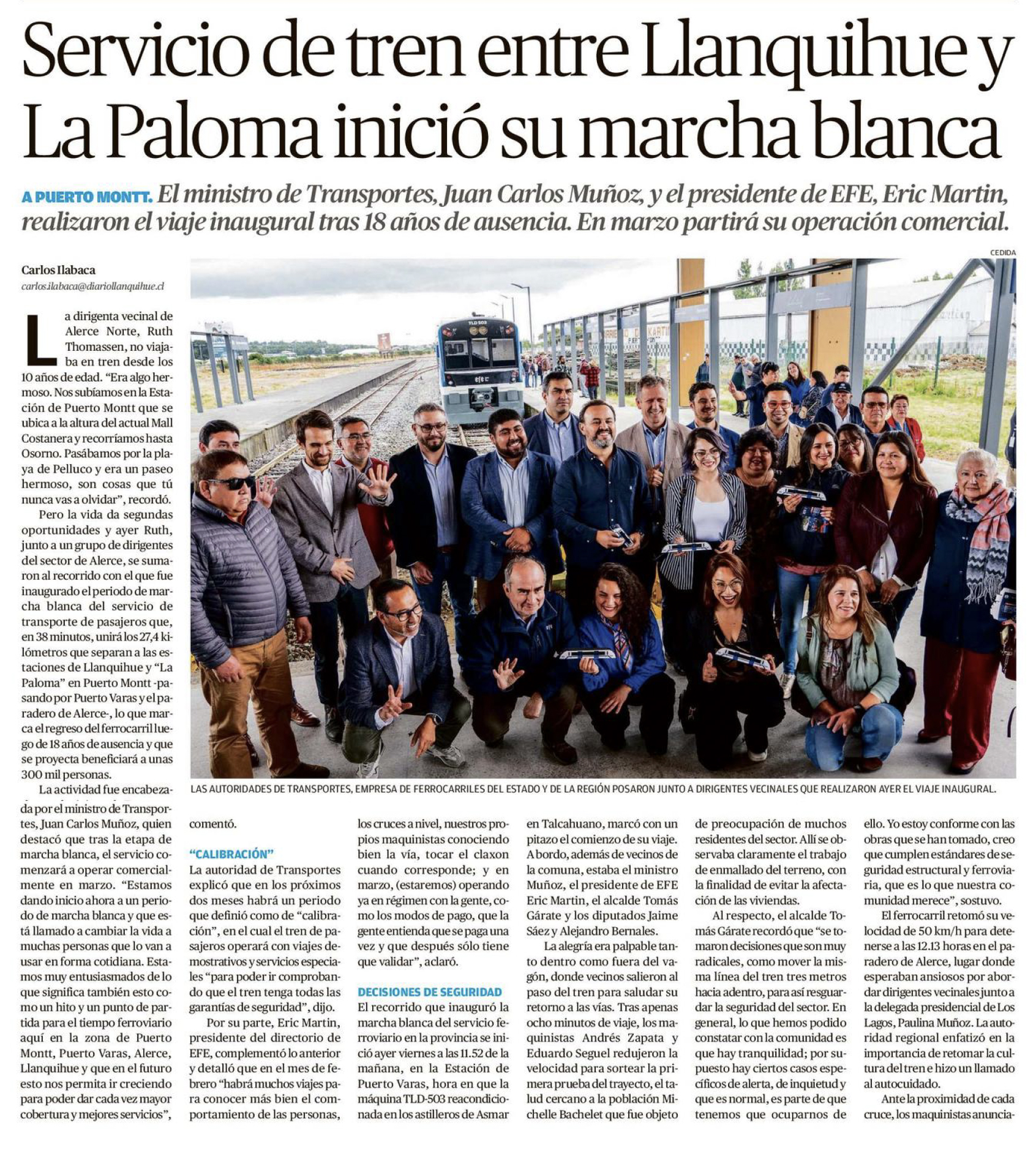 EL LLANQUIHUE – El ministro de Transportes, Juan Carlos Muñoz y el presidente de EFE, Eric Martin, realizaron el viaje inaugural tras 18 años de ausencia. En marzo partirá su operación comercial