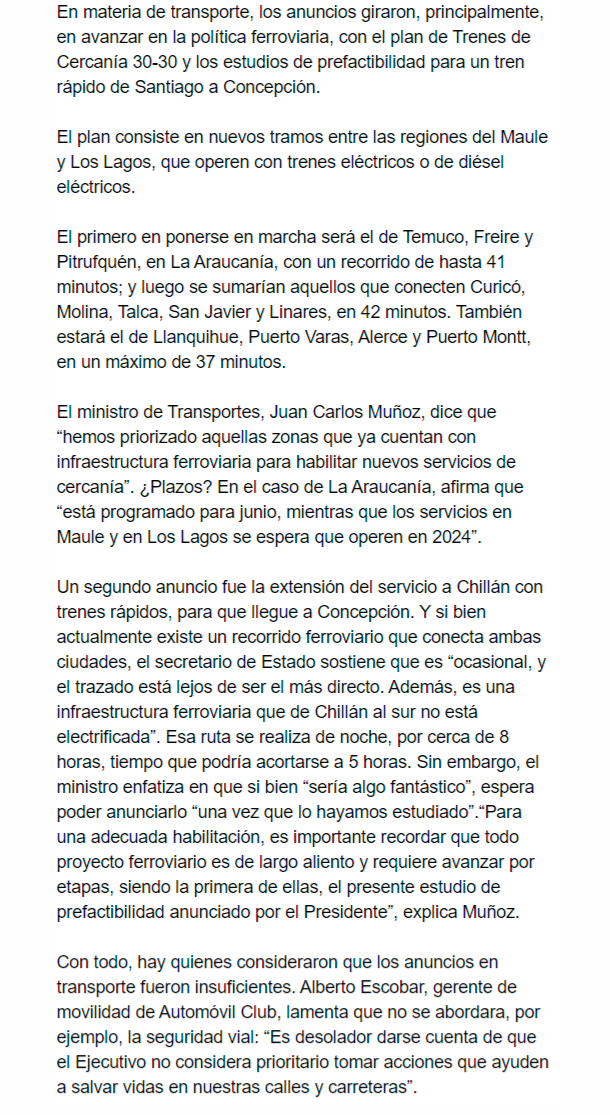 EL MERCURIO – Además, se realizan estudios de prefactibilidad para el tren de Santiago a Concepción.