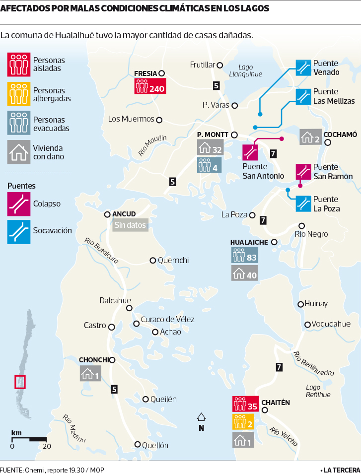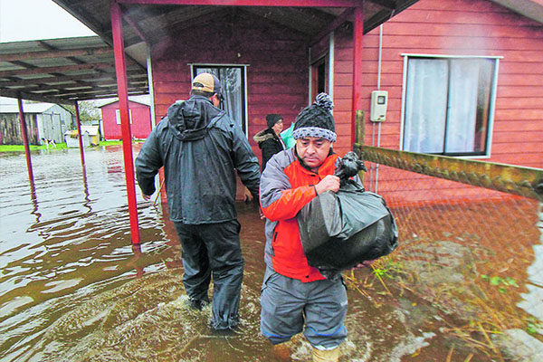 LA TERCERA – Hasta 80 centímetros de agua al interior de las casas. Familias aisladas, cinco puentes afectados y carreteras cortadas. Ese era el escenario que se vivía hoy en la Región de Los Lagos luego de las fuertes lluvias que afectaron la zona el martes y miércoles.