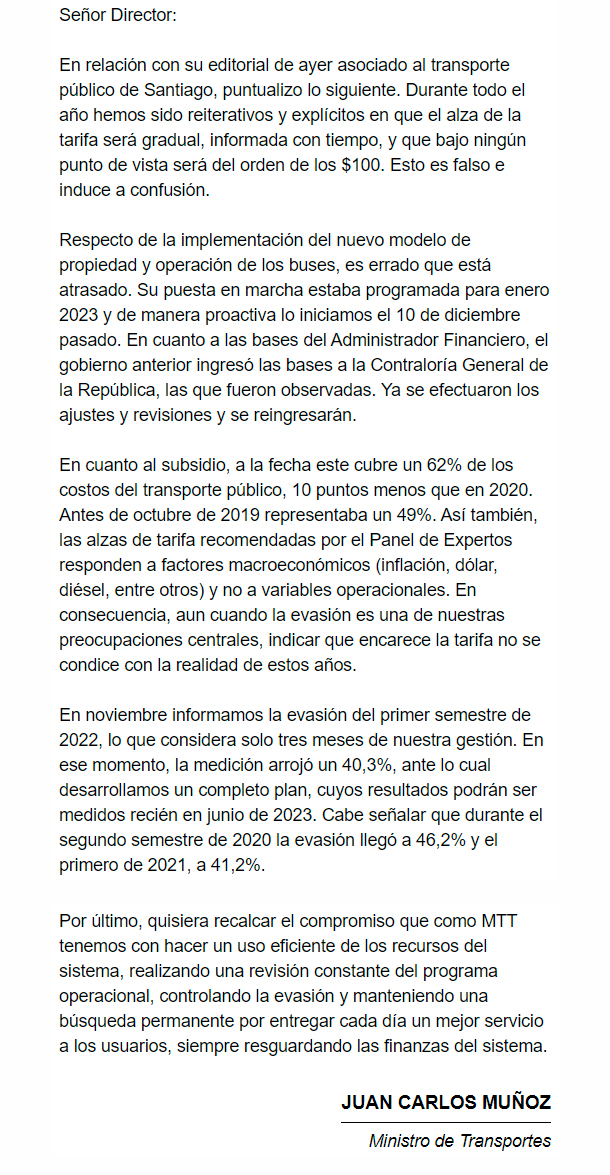 EL MERCURIO – En relación con su editorial de ayer asociado al transporte público de Santiago, puntualizo lo siguiente. Durante todo el año hemos sido reiterativos y explícitos en que el alza de la tarifa será gradual, y que bajo ningún punto de vista será del orden de los $100.