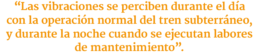 “Se perciben durante el día, bajo las condiciones de operación normal del tren subterráneo, dependiendo de la frecuencia de tránsito y durante la noche cuando se ejecutan labores de mantenimiento. A la fecha los residentes perciben estos eventos como temblores de mediana intensidad equivalentes a un grado IV en escala de Mercalli (…) el efecto radica en la alteración de la calidad de vida, básicamente producida por el stress al asociarse con eventos traumáticos (terremotos), así como en trastornos del sueño”, recoge el expediente a partir de lo denunciado el 28 de mayo de 2018 por Eduardo Herrera Briones, domiciliado en la comuna de Providencia.