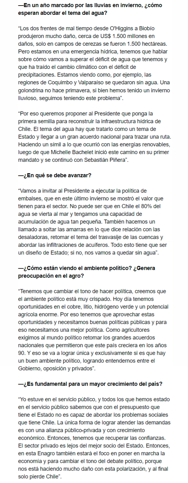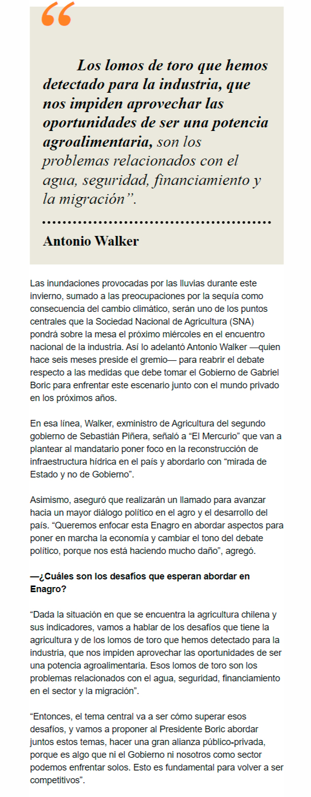 EL MERCURIO – Van a plantear al Presidente Boric que avance con mirada de Estado en trazar una política de embalses, desaladoras y otras materias para “no quedarnos sin agua”.