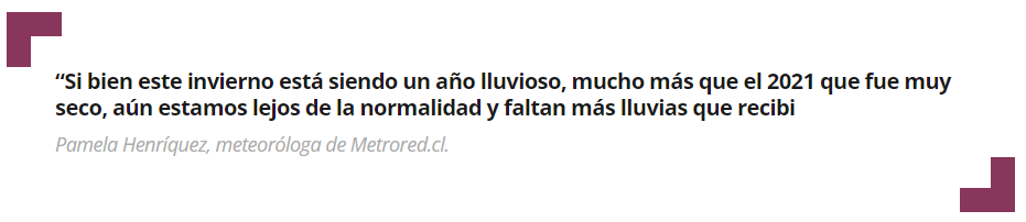 En la Región de Valparaíso, territorio en que se mueven sus análisis, Henríquez dice que “si bien este invierno está siendo un año lluvioso, mucho más que el 2021 que fue muy seco, aún estamos lejos de la normalidad y faltan más lluvias que recibir”. Ella también se basa en el pronóstico estacional que realiza la Dirección Meteorológica de Chile para julio, agosto y septiembre, a lo largo de todo el país: “Estaría con montos bajo lo normal, no queriendo decir que no tengamos lluvias, pero sí más alejado de la normalidad para la época”.