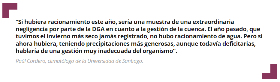 “De lo contrario, sería una muestra de una extraordinaria negligencia por parte de la DGA en cuanto a la gestión de la cuenca. El año pasado, que tuvimos el invierno más seco jamás registrado, no hubo racionamiento de agua. Pero si ahora hubiera racionamiento, teniendo precipitaciones más generosas, aunque todavía deficitarias, hablaría de una gestión muy inadecuada del organismo”, aventura Cordero.