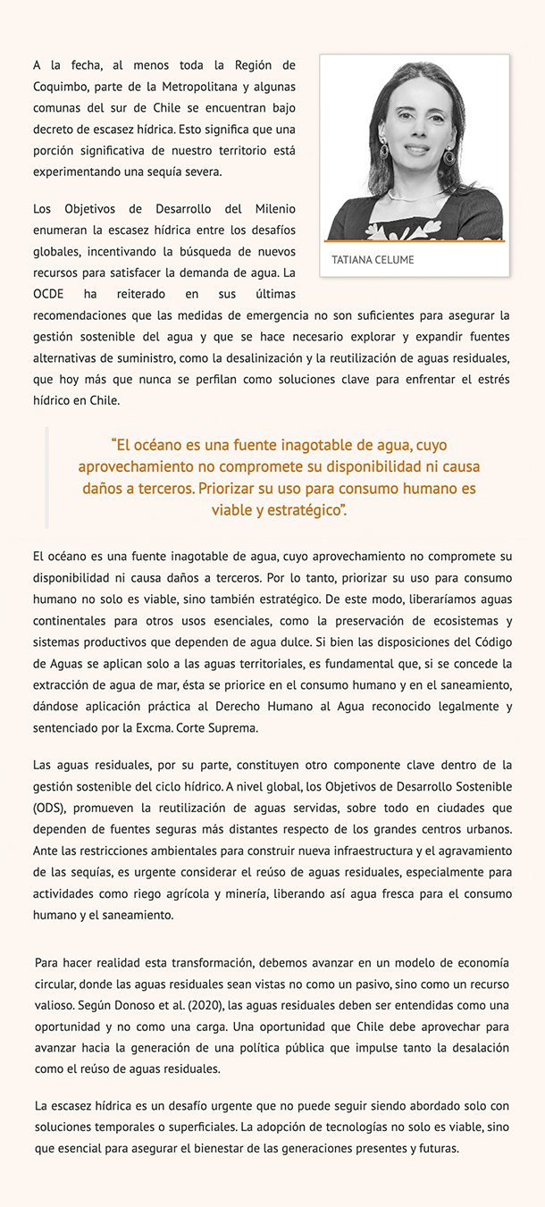 DIARIO FINANCIERO – El océano es una fuente inagotable de agua, cuyo aprovechamiento no compromete su disponibilidad ni causa daños a terceros. Priorizar su uso para consumo humano es viable y estratégico.