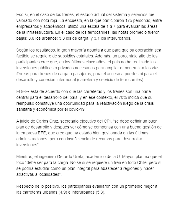 EL MERCURIO – Como una parte central para el desarrollo del país evaluaron los participantes del tercer sondeo de opinión que realiza el Consejo de Políticas de Infraestructura a los servicios ferroviarios a las carreteras.