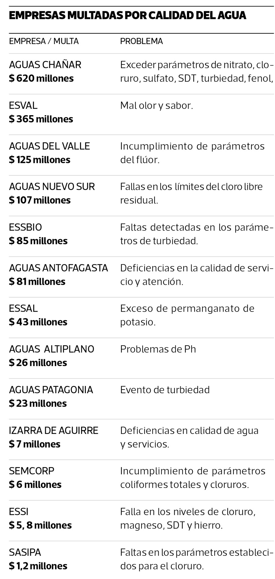 Según información de la SISS, la sanción más alta se cursó a la empresa sanitaria Aguas Chañar, por tres incumplimientos que totalizan multas de $ 620 millones, seguida de Esval, con cuatro faltas cuyas sanciones alcanzaron los $ 365 millones.