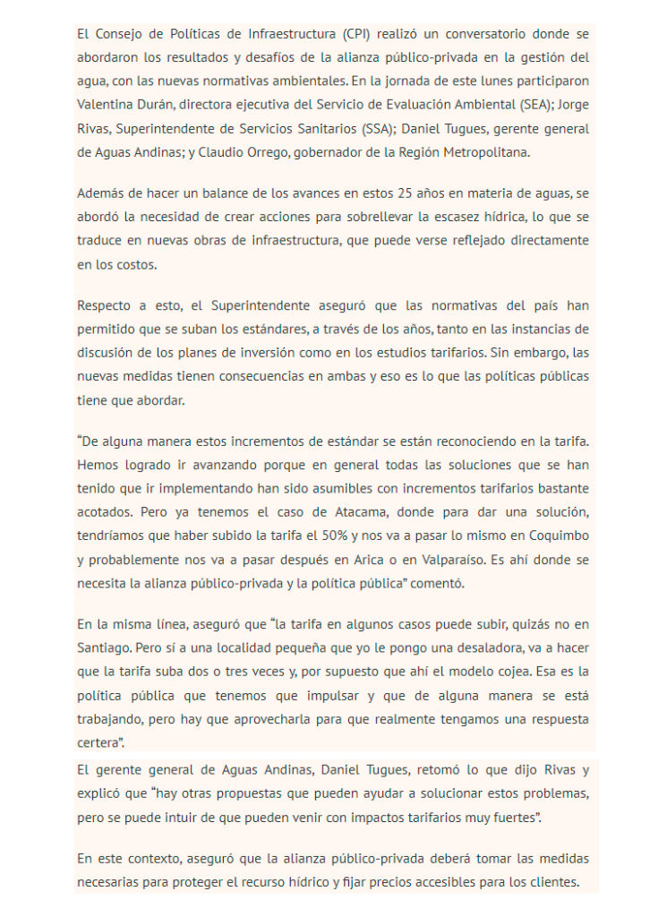 DIARIO FINANCIERO – Entidades analizaron los desafíos para los procesos de fijación tarifarios en una conversación sobre la gestión del agua y sus retos organizada por el CPI.