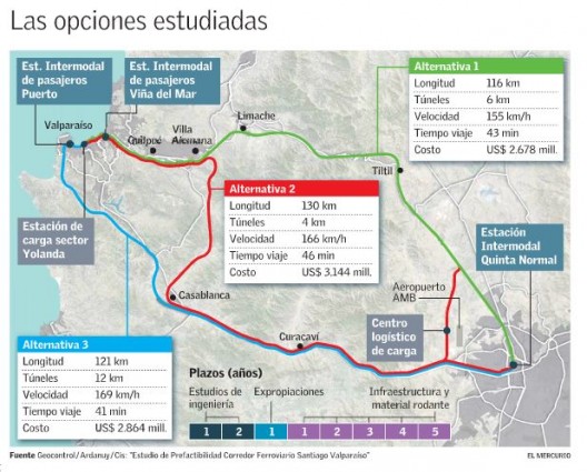 La opción que presentó el consorcio chino-chileno al Ministerio de Transportes (MTT) en enero no es la única, pues a ella se suma una presentada por inversionistas españoles el año 2015, cuya estación principal sería en El Salto, Viña del Mar, aunque ésta fue desestimada por ser similar a la que analizaba EFE y el Gobierno Regional, la cual no ha sido descartada.