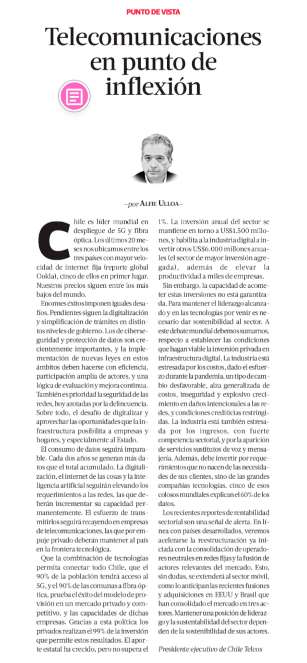 PULSO – Chile es líder mundial en despliegue de 5G y fibra óptica. Enormes éxitos imponen iguales desafíos.